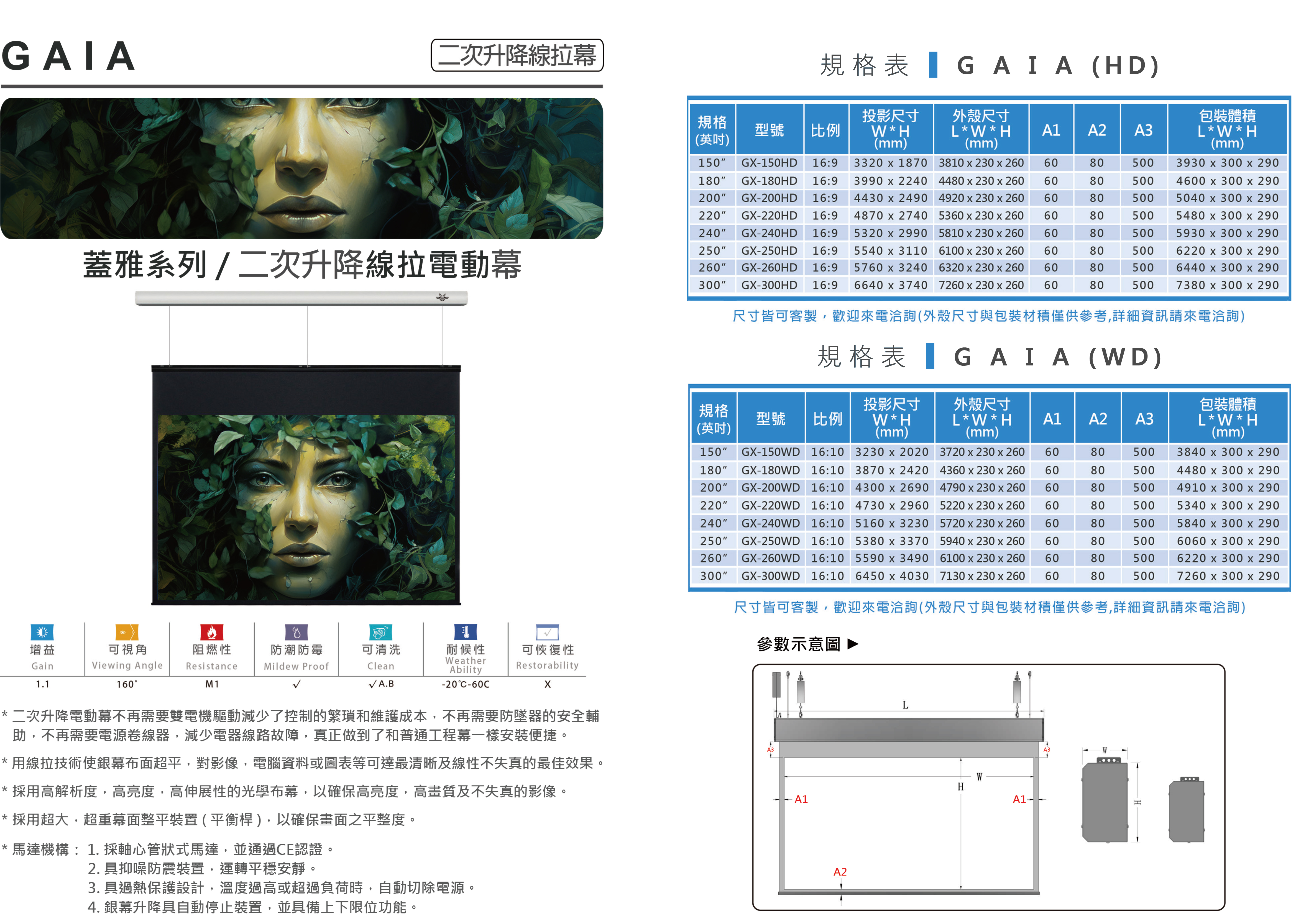 | 150” | GX-150WD | 3230 x 2020 | 3720 x 230 x 260 | 60 | 80 | 500 | 3840 x 300 x 290 |