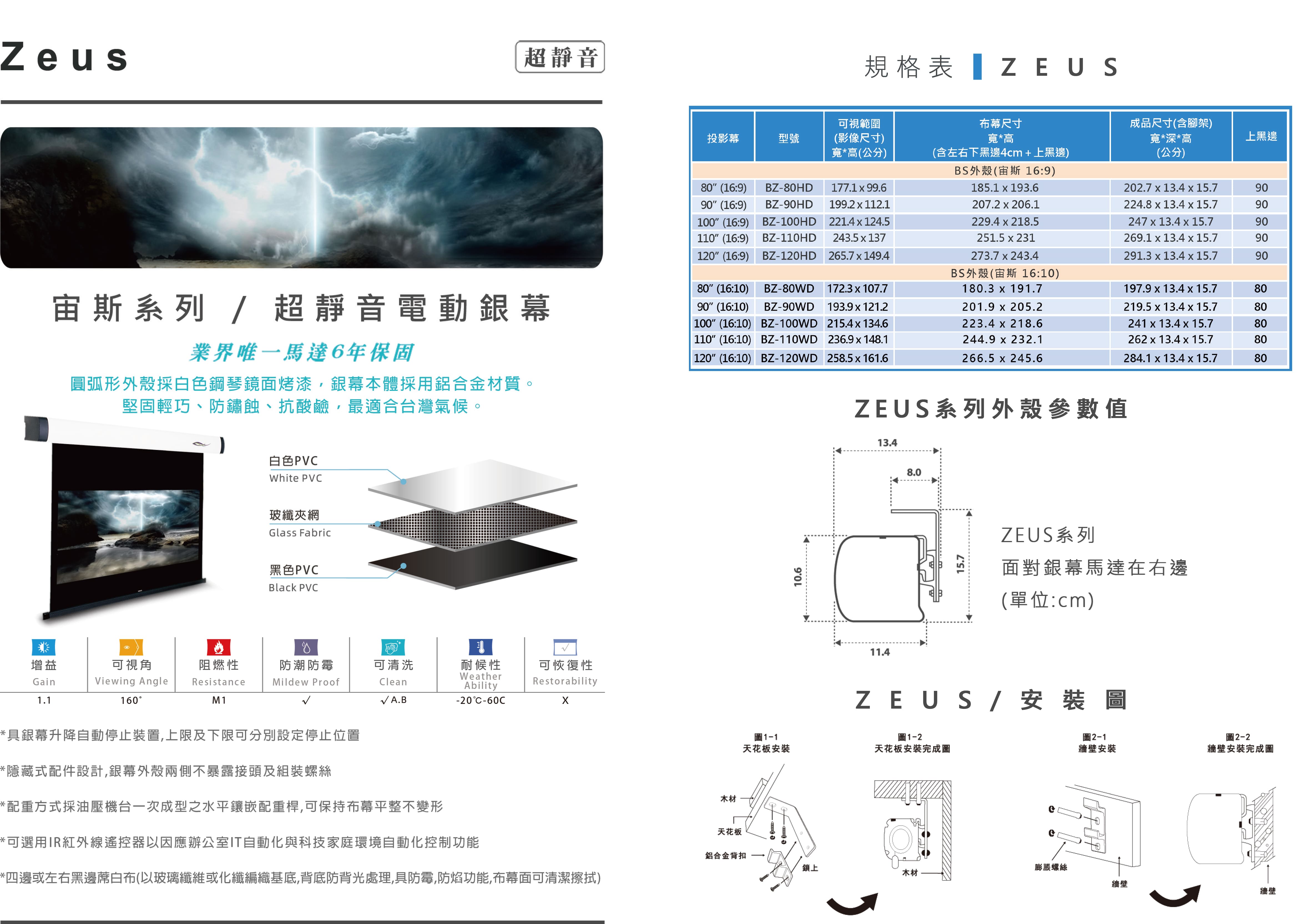 | 100” | BZ-100HD | 221.4 x 124.5 | 229.4 x 218.5 | 247 x 13.4 x 15.7 | 90 |