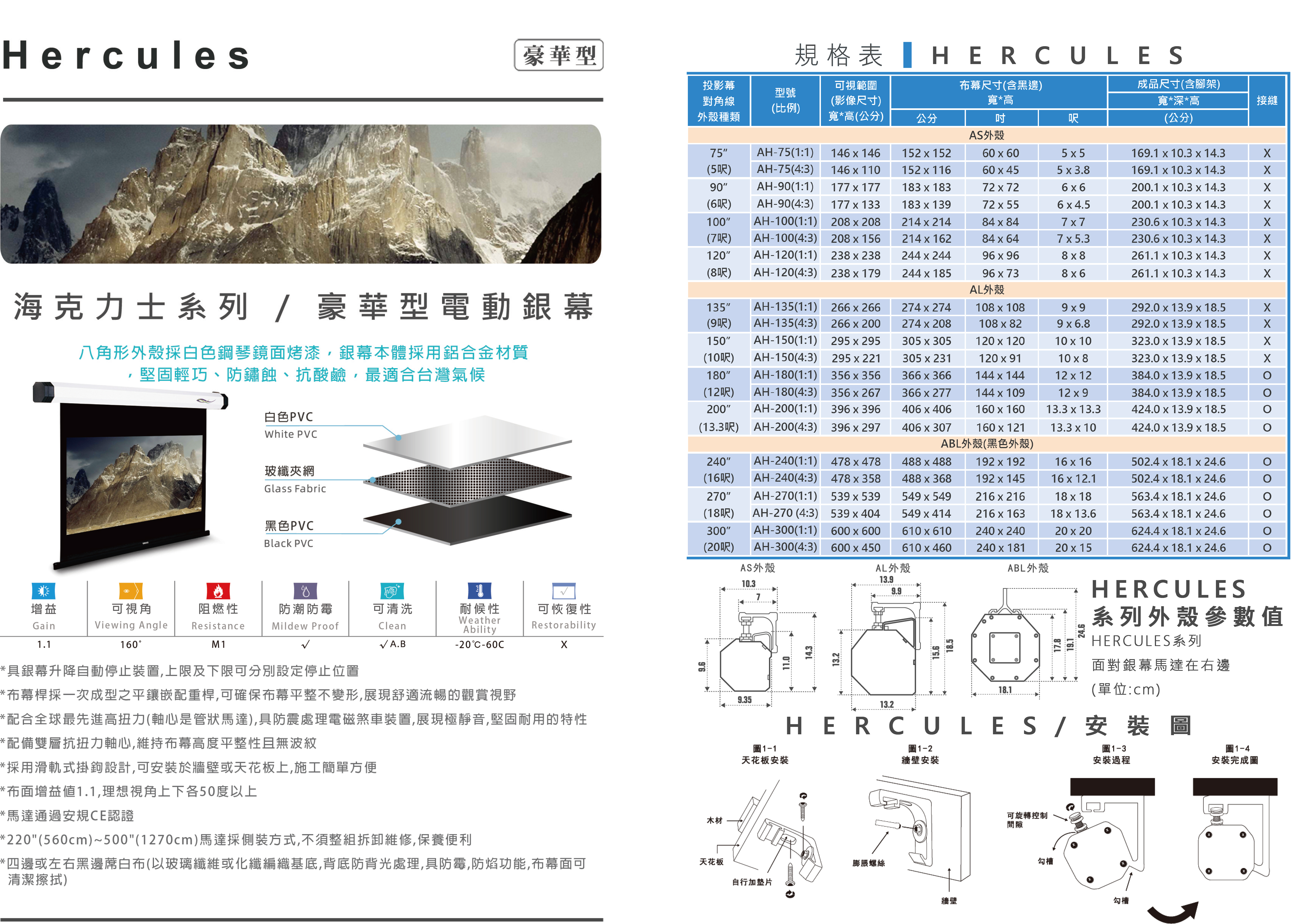 | 135” | AH-135(4:3) | 266 x 200 | 108 x 82 | 9 x 6.8 | 274 x 208 | 292.0 x 13.9 x 18.5 | X |