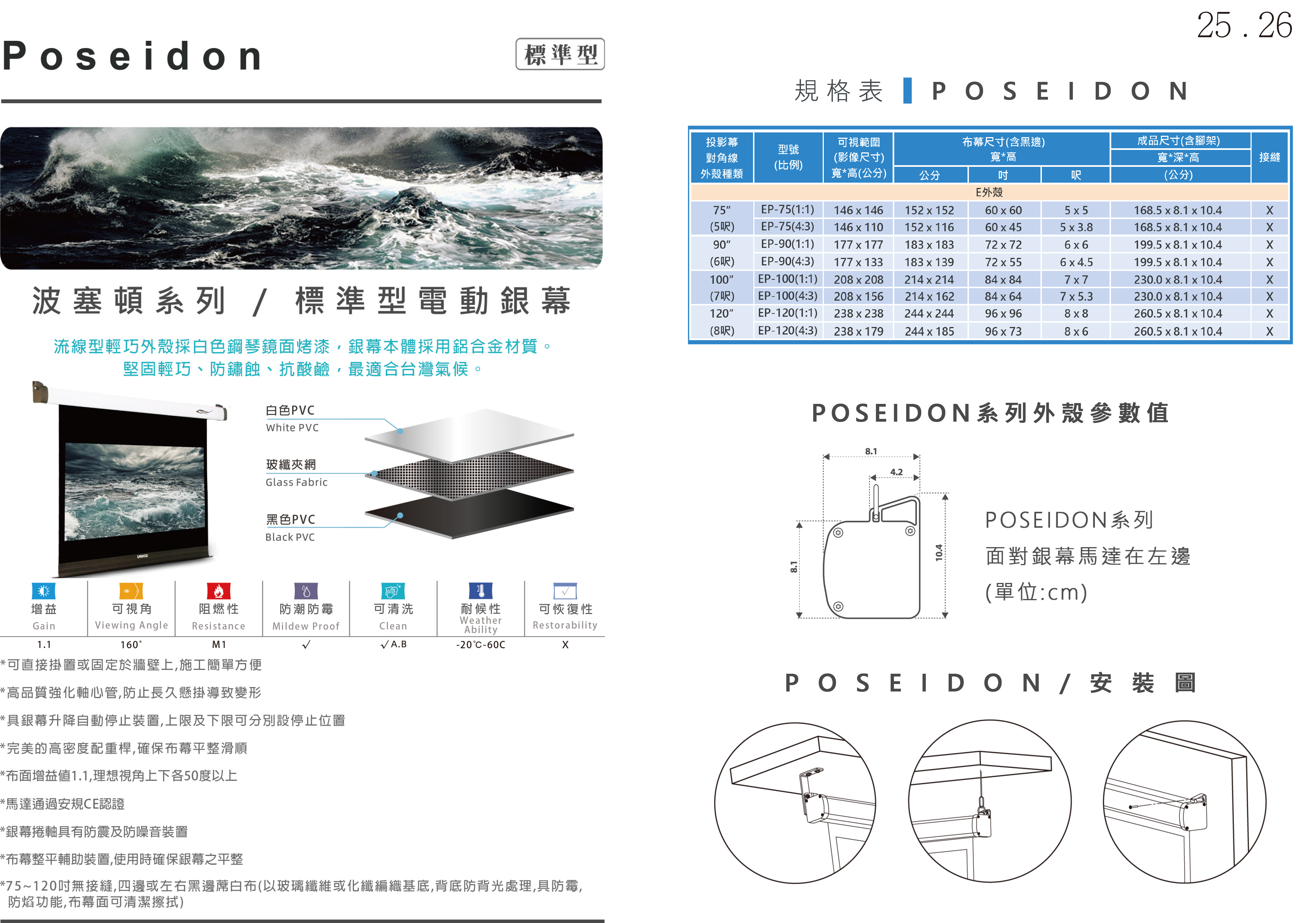 75~120吋無接縫,四邊或左右黑邊蓆白布以玻璃纖維或化纖編織基底,背底防背光處理,具防霉,防焰功能,布幕面可清潔擦拭