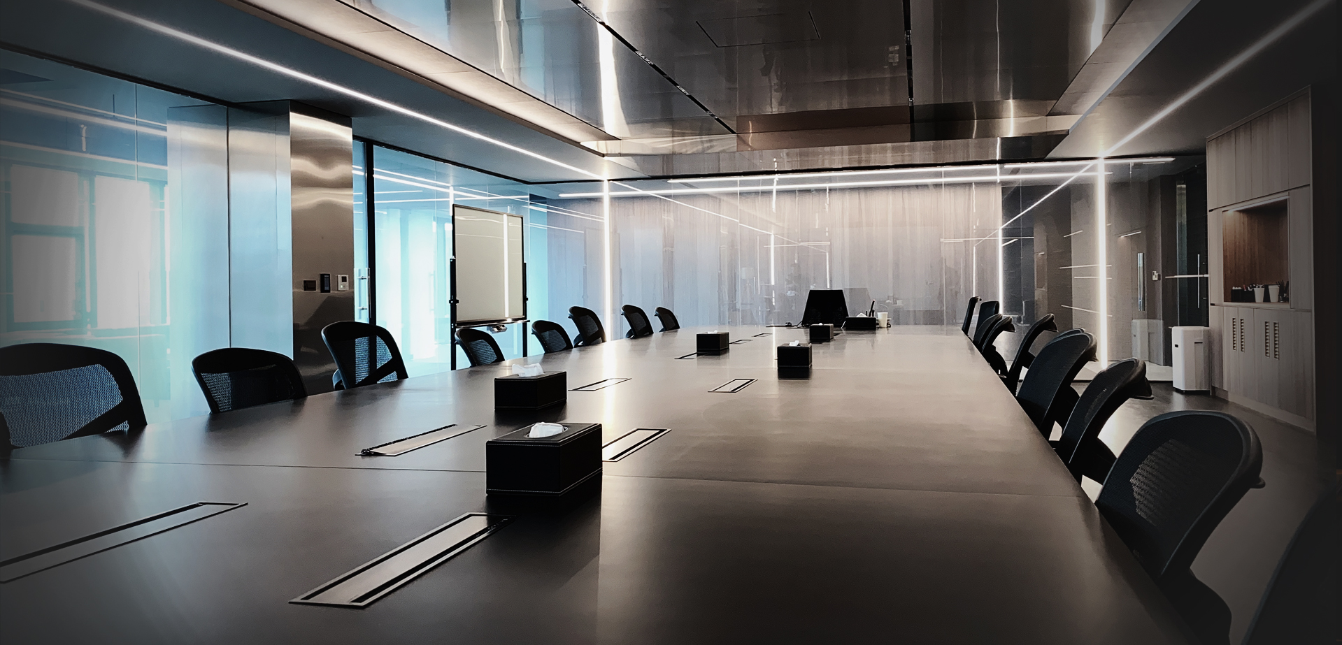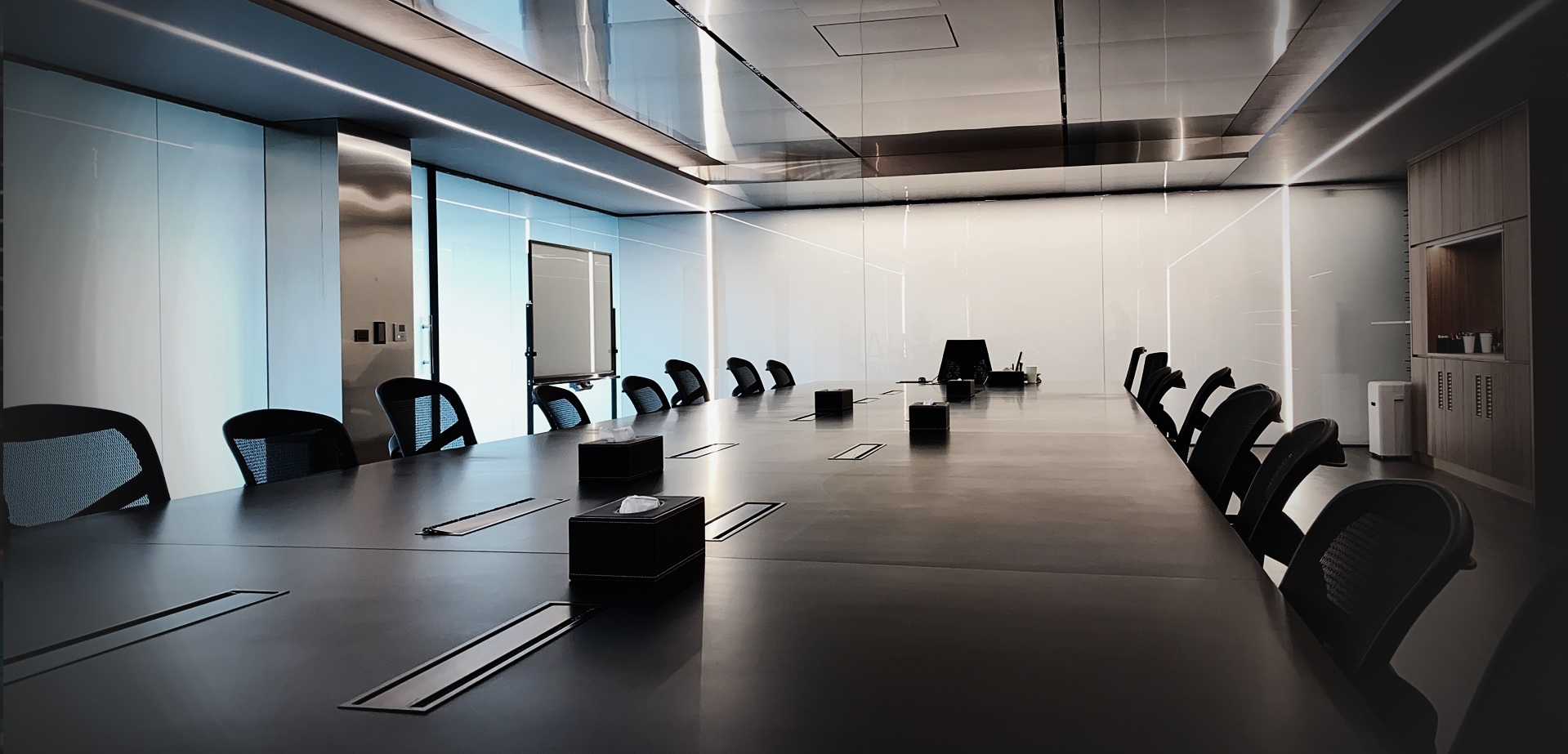 這次施工場地則是位於台中的一家公司的會議室。此會議室為呈現“ㄇ”字型的三面玻璃窗。業主希望三面玻璃窗皆能貼滿電控膜,讓會議室能夠同時擁有開放與隱私的高機動性。而這次的電控膜數量也是創了目前案場新高總計30片。